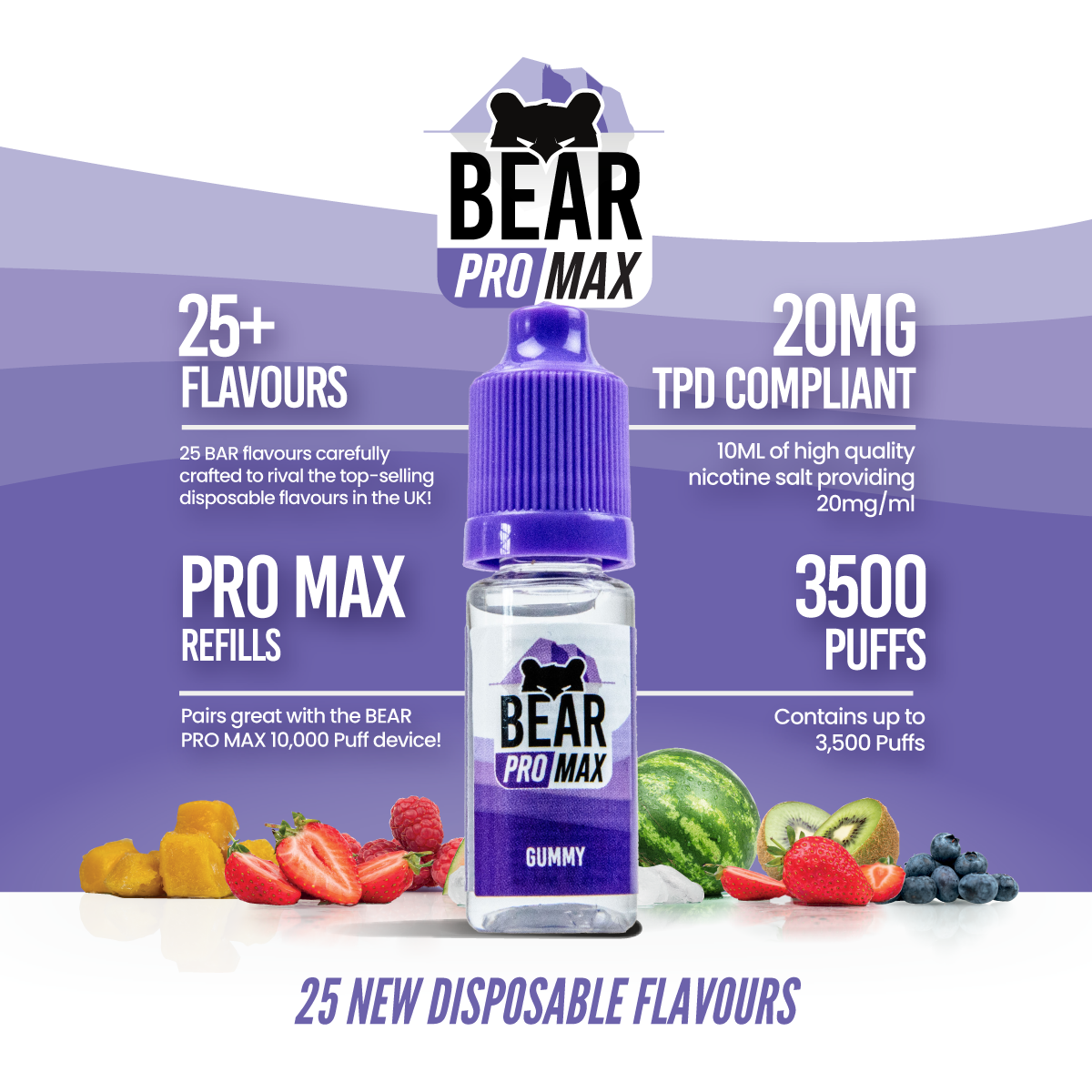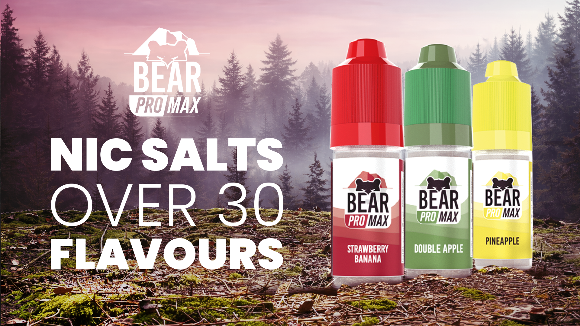 - BEAR Pro MAX 75ml Refills – Zero-nicotine bases with four included salt nic shots for a 10mg finish. Inspired by top disposable flavours.